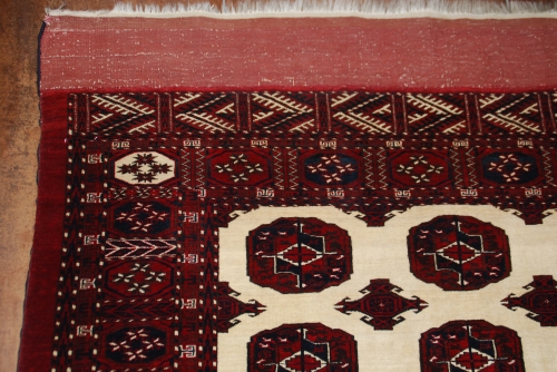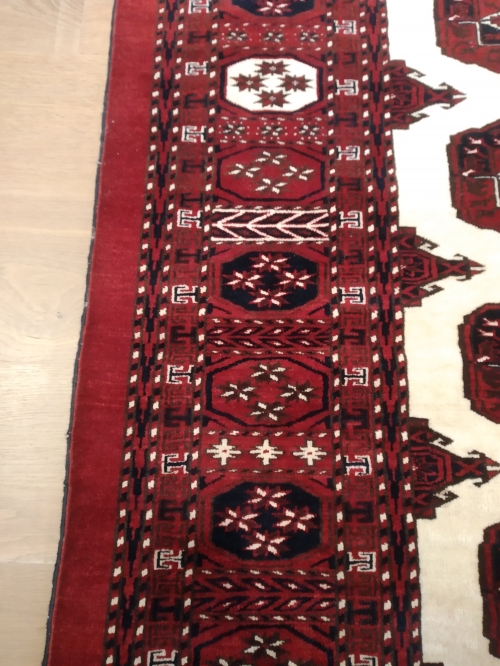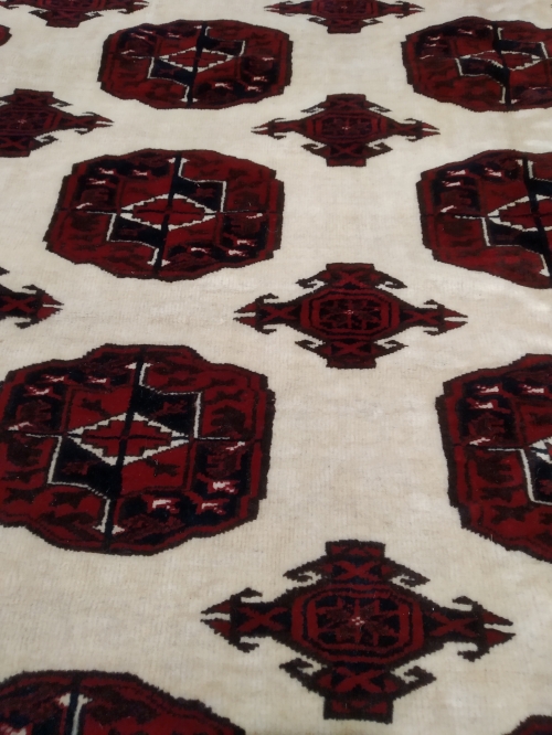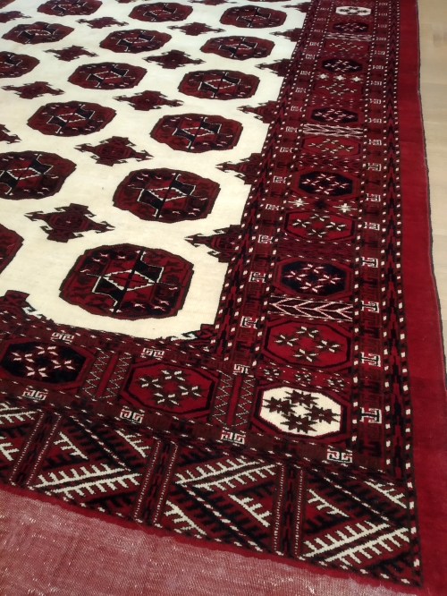 Tapis turkmen "Boukhara" , 290cm X 215cm , noué à la main vers 1940 sur chaine et trame en laine.